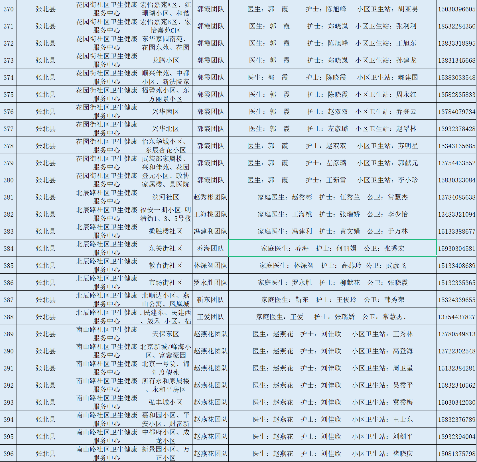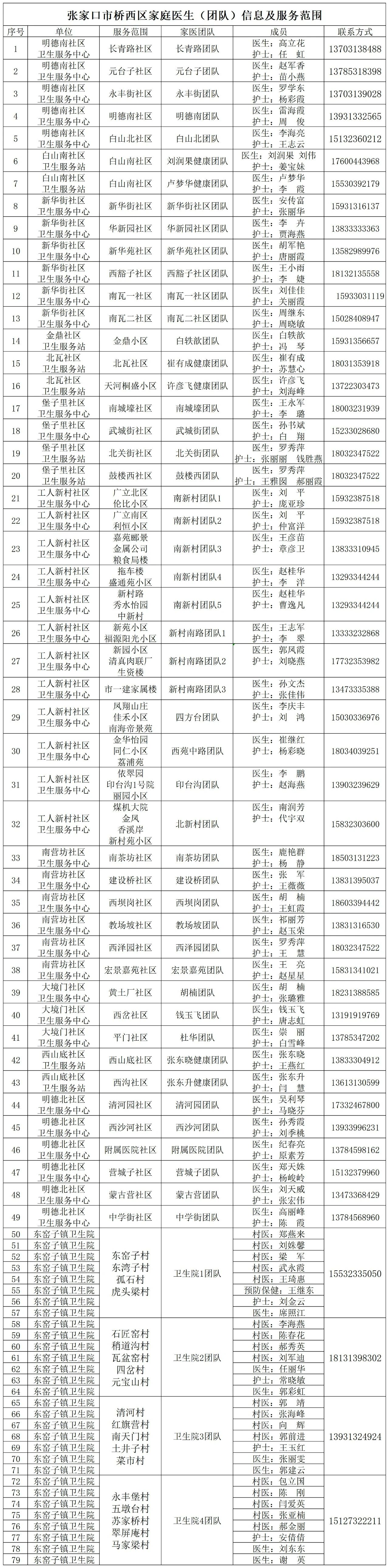 附桥东区、桥西区、万全区、宣化区、张北县、怀来县、经开区家庭医生(团队)信息汇总: 经开区公布家庭医生(团队)信息及服务范围为更好的满足居民群众就近就医需要,现将我区家庭医生团队信息及服务范围予以公示,如出现发热、咳嗽等症状,居家治疗不见好转时,可联系相应的家庭医生团队,家庭医生将根据您的实际情况提供相应服务。