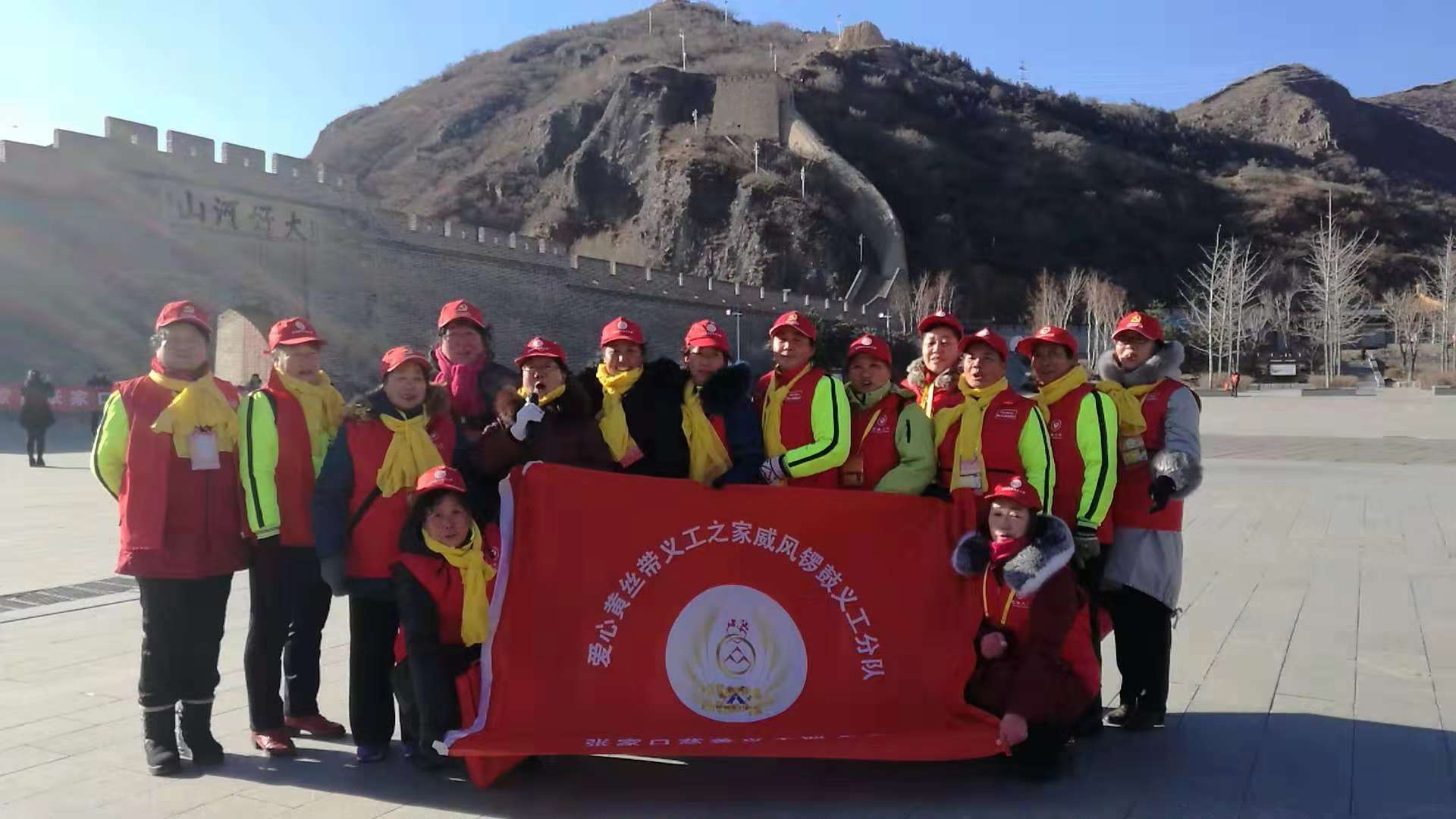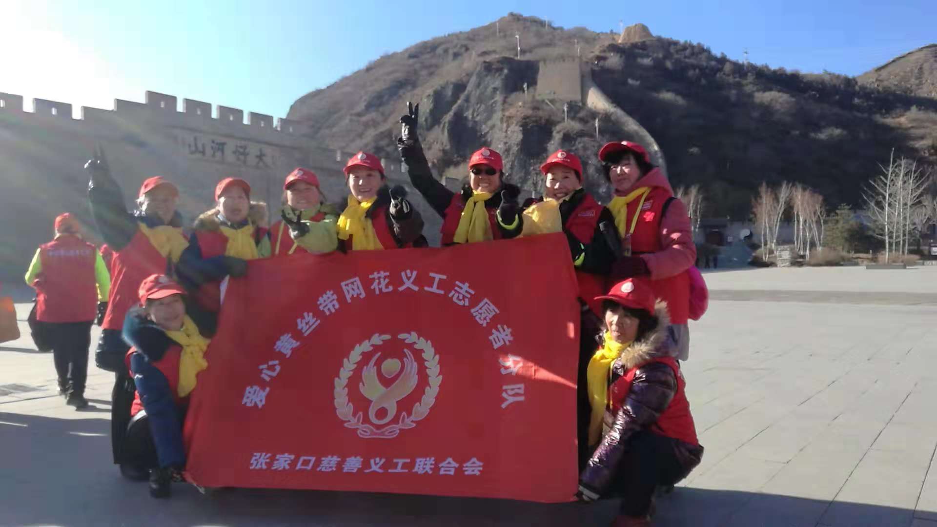 2018年12月11日上午,我们黄丝带志愿者之家的老师们在大境门景区参加"重温志愿者誓词"活动。今天尽管是寒风凛冽,但大家的热情丝毫不减。九点钟老师们从不同地方汇聚到大境门广场,空旷的广场上顿时热闹起来,小红帽、红马甲的身影整齐的排列在城墙下,共有六支分队,七十多名老师参加。宣传部王志宏部长带领在场的所有志愿者重温誓词: 我宣誓:我自愿成为一名光荣的志愿者。 我承诺:尽己所能,不记报酬,帮助他人,服务社会。积极参加公益活动,践行志愿精神,传播先进文化,为构建和谐社会贡献力量!重温誓词这是我们做为一名黄丝带志愿者的骄傲与自豪!以志愿为名,服务社会,黄丝带志愿者一直在行动。