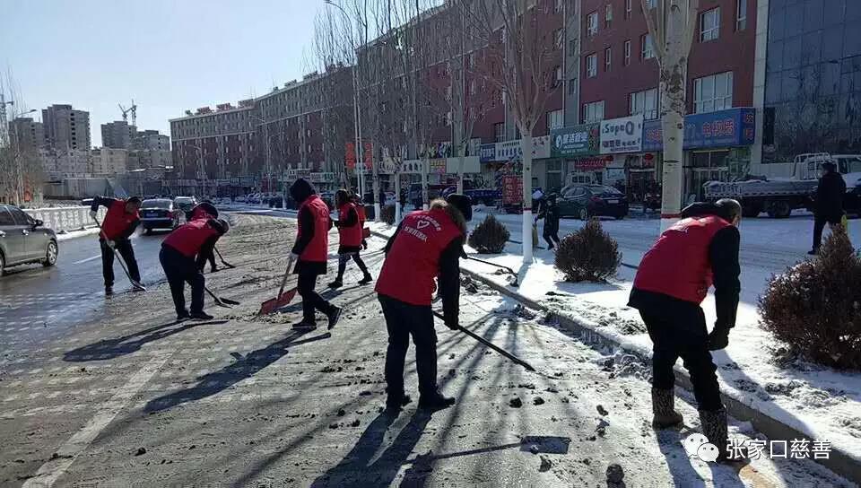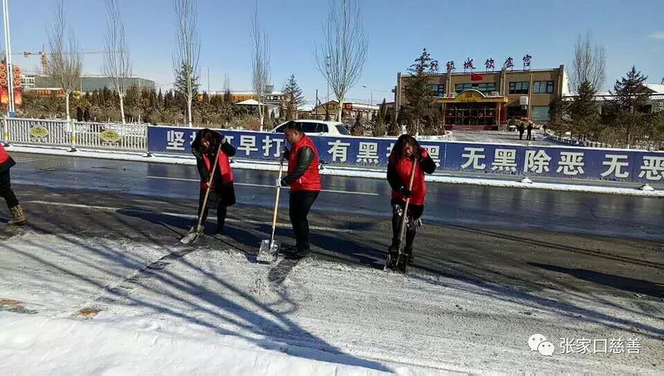 这场雪一直持续到晚上才停,怀安县手拉手爱心团队的志愿者们,在雪停之后陆续拿着工具冒着严寒清理各街道的积雪,力求让大家在出行的时候多一分安全保障。