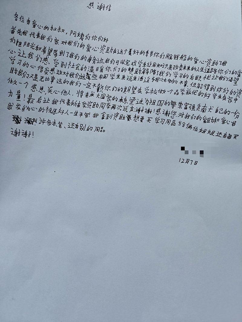 孩子们的母亲们眼中噙满了泪水,她们对宣化慈善义工联合会的感激之情溢于言表。为了表达这份深深的谢意,每位母亲都亲手写下了一封感谢信。信中的一字一句,都饱含着她们对慈善义工们无私奉献的敬意与感恩,以及对孩子们未来的美好期许。这些感谢信不仅仅是几张纸,更是受助家庭与爱心组织之间情感交流的桥梁,它们见证了爱心的传递与汇聚,彰显了人性的美好与善良。