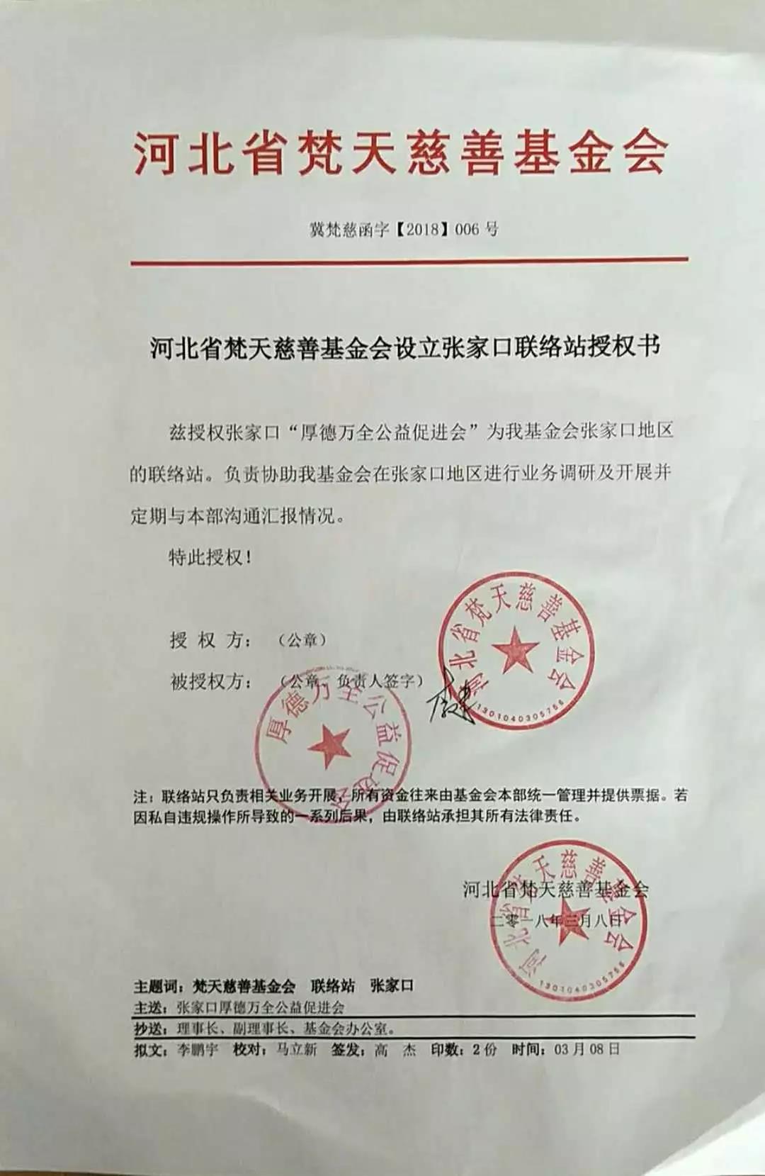 厚德万全公益促进会成为河北省梵天慈善基金会张家口地区联络站