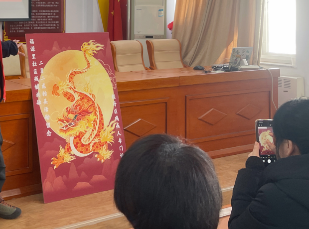 活动以二月二“龙抬头”民俗文化为切入点,特邀专业美术老师班嘉琦进行现场指导。通过展示青铜器龙纹、建筑云纹等传统纹样图谱,讲解“龙腾四海”“祥云纳福”等纹样寓意,并示范晕染、勾线等基础技法。参与者自由组队创作,所用绘画材料均由龙匠艺术残疾人就业工坊赞助提供。 创作过程中,残障居民与健全居民通过调色协作、构图讨论等互动达成默契配合。不同群体在平等协作中增进理解,一幅幅融合传统纹样与现代审美的画作逐渐成型。活动以共同创作形式促进群体交流,打破固有隔阂,让传统文化成为情感联结的纽带。
