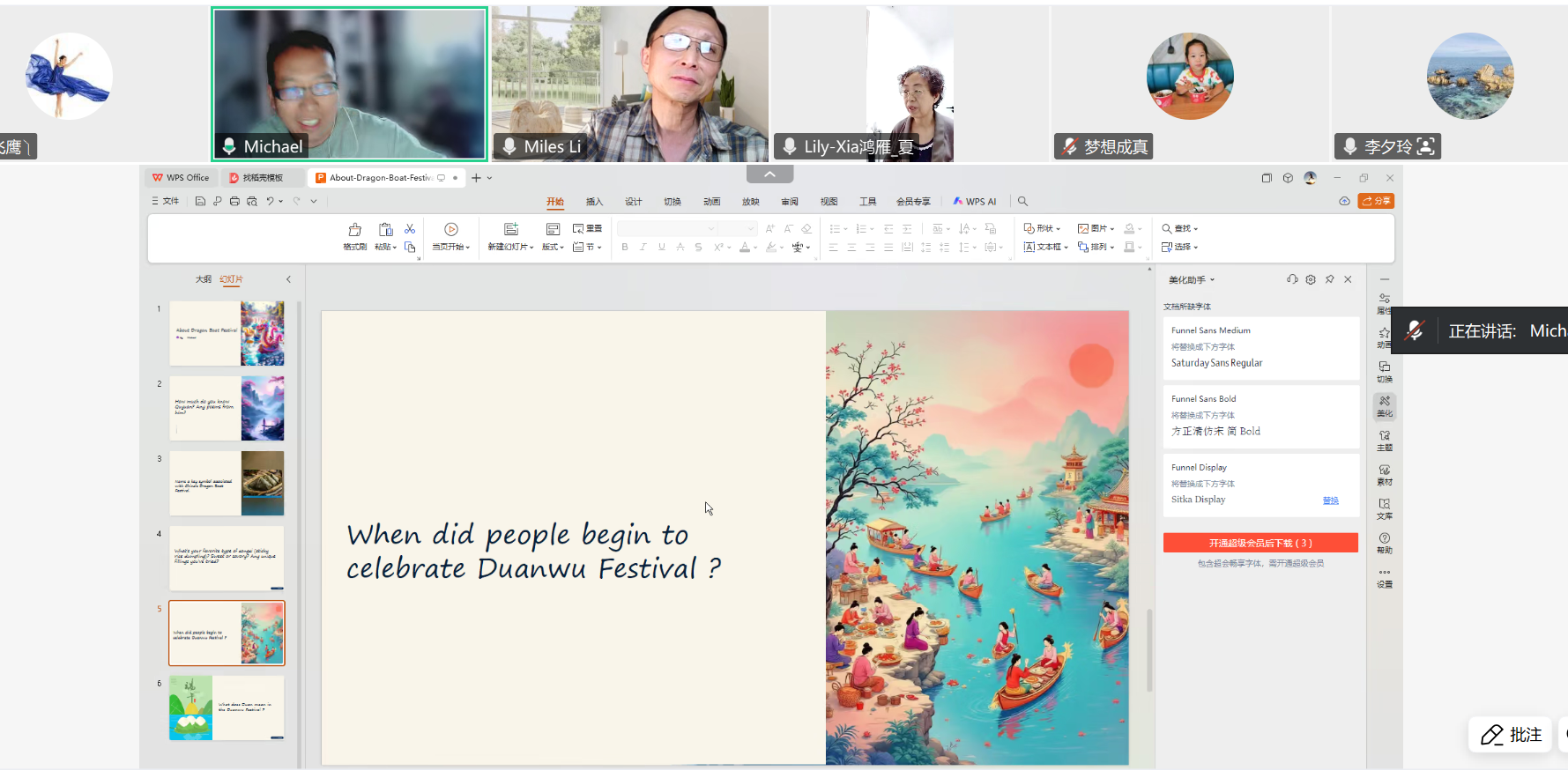 随后,各位成员纷纷分享自己的内容,多年旅居海外的Mr. Li深情讲述了海外华人庆祝中国传统节日的场景,言语间既有 “每逢佳节倍思亲” 的乡愁,也有在异国他乡努力适应的坚韧,不变的是对祖国和家人深深的眷恋;Sarah以 “为什么端午节要划龙舟” 这一问题抛砖引玉,引发了大家热烈的讨论,不同观点相互碰撞,现场氛围瞬间被点燃。夏老师和李老师不仅分享了自己准备的内容,还自豪地介绍自己每年都会亲手包粽子送给亲朋好友,用实际行动诠释着中国传统节日的温情与意义;外语角队长May则详细介绍了粽子、五彩线、雄黄酒、赛龙舟等端午节的传统元素,并带领大家学习对应的英文表达,干货满满;网友 “呵护” 也分享了自己在北京工作,却坚持端午节回家陪伴孩子过节的暖心故事。