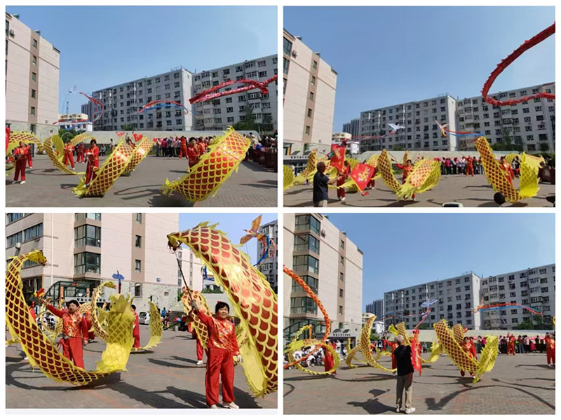 首先,张家口龙之队带来的舞龙表演,《吉庆锣鼓》拉开了活动序幕,其中金色小龙上下翻舞,龙飞凤舞气势磅礴,高杆龙在空中四周盘旋,仿佛活灵活现,龙旗像是飞火轮一样左右翻滚,栩栩如生的壮观场面不断迎来社区居民阵阵掌声。