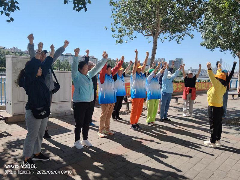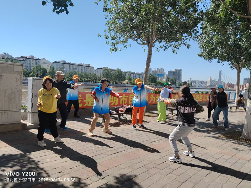 阳光正好,微风不燥。6月4日上午海豚志愿服务队带领大家从室内走向户外,来到风景优美的清水河边,开展健身操、八段锦和《感恩的心》的练习。在这个明朗的天空下,快乐在每个人的脸上肆意生长,现场充满了欢声笑语。