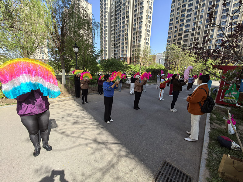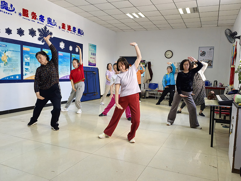 舞韵与健康并行:从肢体律动到科学养生 交谊舞课堂上,专业老师从基础步伐“慢三”“快四”入手,带领学员们在悠扬的旋律中学习旋转与配合。“手要轻搭,步伐跟上节奏,笑容要自然!”老师的指导让学员们逐渐摆脱拘谨,两两搭档间默契渐生,不少零基础的学员也露出了自信的笑容。 扇子舞课则以《茉莉花》为背景音乐,彩扇翻飞间,学员们手持绘有花鸟图案的折扇,配合柔美的身段,演绎出传统舞蹈的雅致韵味。65岁的张阿姨兴奋地展示刚学会的“挽扇”动作:“跳起来既锻炼了身体,又觉得自己精气神十足,像回到了年轻时候!” 养生操课结合中医经络理论,通过拍打足三里、按摩心包经等动作,引导学员们在舒缓的节奏中调理身体。“每节课后都觉得浑身通透,回家还要教老伴一起练。”学员李大叔分享道。