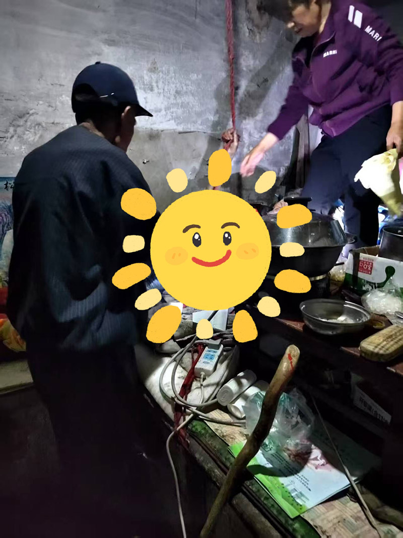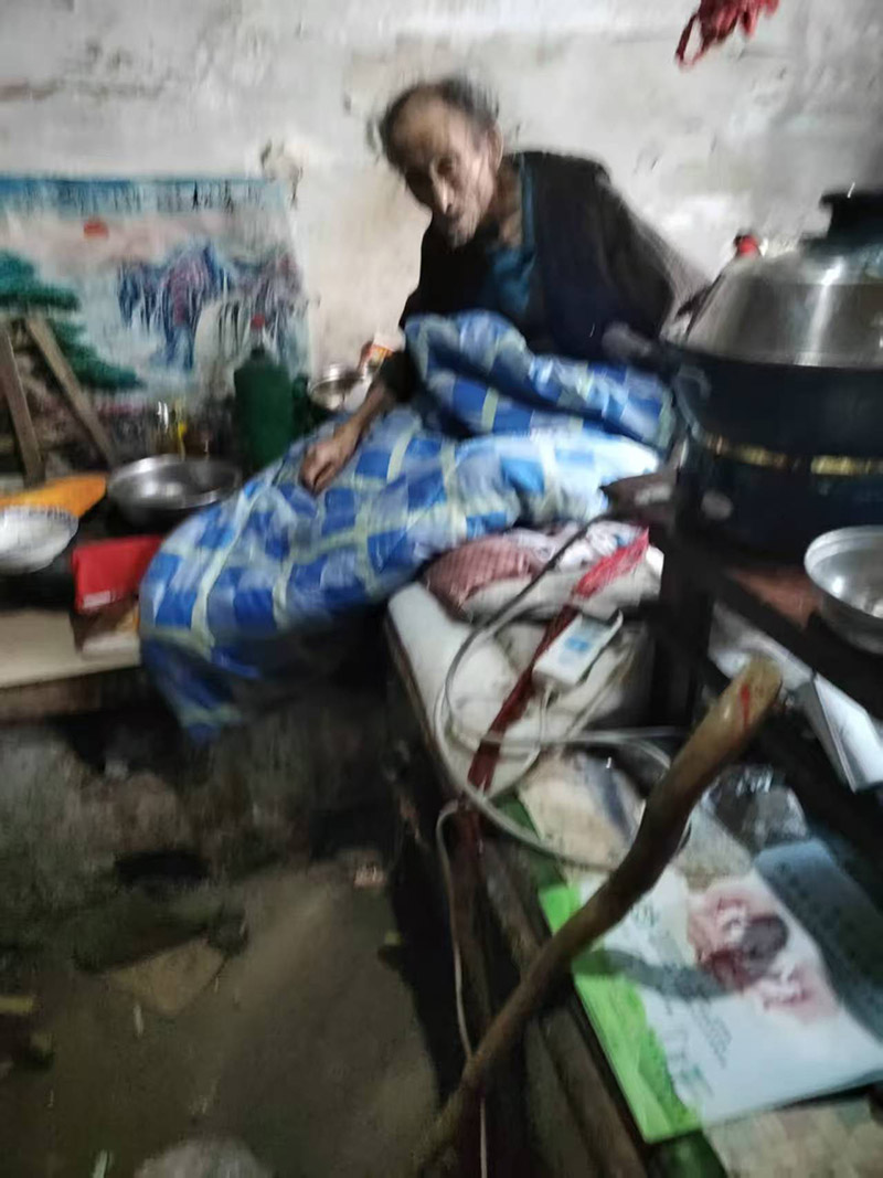 老人因腿部骨折,下肢基本不能运动,生活不能自理,都在炕上,经常凑合吃一口,有时村里的好心人也给送点饭菜。
