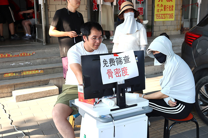 中医科诊台前,其他中医医生们也运用精湛的医术为居民进行中医脉诊。他们通过“望、闻、问、切”,详细了解居民的身体状况,耐心解答居民关于中医养生、调理身体等方面的疑问。护理人员们则在各个检测区域有条不紊地协助医生进行各项检查工作。在血压、血糖测量区,她们动作娴熟,精准地为居民测量血压、血糖,并认真记录检测数据。对于血压、血糖偏高的居民,护理人员还会给予贴心的护理指导,提醒他们注意饮食、加强锻炼,必要时及时就医。在骨密度检测区,护理人员熟练操作骨密度检测仪,为居民进行骨密度检测,并根据检测结果,向居民讲解骨质疏松的预防和治疗方法。