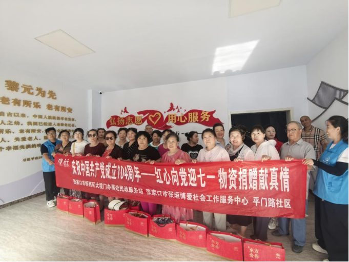 为庆祝中国共产党成立104周年,弘扬党的光荣传统和优良作风,同时积极践行社会责任,传递社会温暖,2025年6月23日,慈善终端张家口市桥西区办公室联合桥西区社会工作指导中心、张垣博爱志愿者团队、张垣博爱社会工作服务中心在大境门街道平门社区成功举办了“红心向党迎七一 物资捐赠献真情”活动。此次活动为平门社区送去了生活物资,以实际行动助力为老养老服务,向党的生日献礼 。