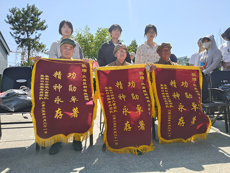 这次活动让团队志愿者们走进老兵们的生活,聆听他们讲述往昔的峥嵘岁月。每一位抗战老兵、志愿军英雄,都是一本厚重的历史书,他们用自己的青春与热血,书写着中华民族不屈不挠、奋勇抗争的壮丽篇章。 活动中,张家口关爱抗战老兵团队为老兵们献上了“功勋卓著 精神永存”锦旗,表达敬意。志愿者们和老兵们共同联欢,共进午餐,载歌载舞用欢声笑语传递着对老兵们的敬佩,老兵们脸上洋溢着幸福的笑容。那些在枪林弹雨中穿梭的身影,那些面对强敌毫不退缩的坚毅眼神,那些为了民族独立与解放不惜牺牲一切的伟大抉择,都在他们的回忆中变得鲜活起来。