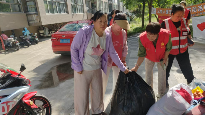 志愿者们抵达活动现场后,先把活动条幅挂起来,为了吸引更多居民参与活动,还把音响打开播放动听的音乐,随着音乐声居民们络绎不绝的走了过来。这时韩队长和志愿者们开始文艺汇演,唱红歌、扭秧歌,用艺术形式传递正能量,丰富社区居民的精神文化生活。不一会这里就堆满了居民们拿来的衣物、电器,有的居民特意回家翻出崭新未穿过的冬衣,有的则精心擦拭好旧电器确保正常能用,志愿者们认真登记、分类、打包、现场忙碌而有序。