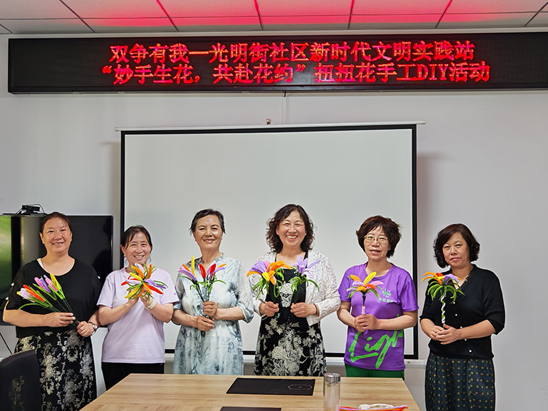 - 扭扭棒大麦花制作:课程将彩色扭扭棒与干燥的大麦秸秆结合,教大家制作复古干花束。学员们先将扭扭棒折成花瓣形状,再与麦穗、丝带搭配组装,不一会儿,一束束别致的“大麦花”就完成了。68岁的赵阿姨说:“亲手做的花摆在客厅,看着就开心。”