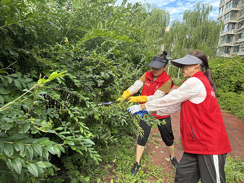 养护活动中,对长得过于密集的绿地草坪和遮住阳光的高大树木进行修剪,志愿者手持镰刀、锯片、锄头对草丛和树木进行除草剪枝,专业人员使用除草机和修枝机进行养护和整理,有的杂草需要连根拔除,有的树木只保留一米左右的高度,有的树木只需要修剪树枝。刚刚入秋,天气还是十分炎热,大家汗水浸透了衣服,顺着脸颊流淌下来,但无一人报怨,整个操场充满了浓浓的活动氛围。他们都在为美化小区的环境辛勤付出。