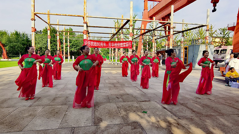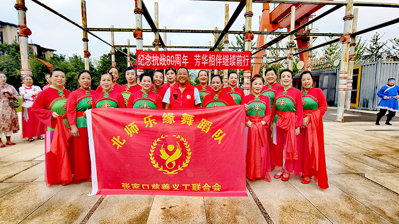 铭记历史,砥砺前行。今年是中国人民抗日战争暨世界反法西斯战争胜利80周年。8月31日,澄澈阳光铺满张家口工业文化主题公园的每一个角落,一场名为“纪念抗战胜利80周年·芳华相伴,继续前行”的芳华岁月线下文艺展演,在此正式拉开帷幕。红色旋律在微风中流淌,青春气息与历史厚重感交织碰撞,为这座城市注入了缅怀峥嵘岁月、致敬革命英雄的深沉情感,也让每一位到场者的心中,悄然升腾起对和平的珍视与对未来的期许。 北师乐缘舞蹈队作为此次展演的参演队伍之一,自接到邀请便全心投入准备。活动当天,在队长路玉兰、窦喜荣的带领下,队员们身着统一整齐的服饰,个个精神抖擞、容光焕发,准时抵达展演现场。当激昂的音乐奏响,队员们迈着坚定的步伐走上舞台,一支《中华全家福》缓缓展开——舒展的舞姿里,藏着对家国的深情眷恋;默契的配合中,尽显新时代中老年群体的活力与风采。她们用灵动的肢体语言,将对祖国的热爱、对和平的向往融入每一个动作,不仅跳出了新时代的精神风貌,更以艺术之名传递着跨越时空的红色信仰,赢得台下观众一波又一波热烈的掌声。