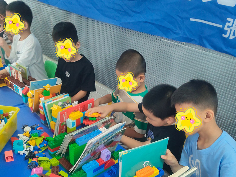 活动现场,书本不再是静静躺在书架上等待翻阅的静态存在,而积木也不再是单纯的游戏工具。在老师富有启发性的引导下,孩子们将书本与乐高积木大胆结合,开启了一场奇妙的创意冒险。有的孩子将书本竖立排列,模拟出连绵的山峦,再用积木搭建蜿蜒的阶梯;有的则把书页摊开,用积木在上面构建起一座精致的城堡,书页仿佛成了神秘的护城河。甚至有孩子突发奇想,把书本卷成圆筒,再用积木拼接出帆船的桅杆和船身,打造出一艘扬帆起航的“知识之船”。每一个作品都独一无二,每一道搭建的痕迹都写满了孩子们对世界的奇思妙想。