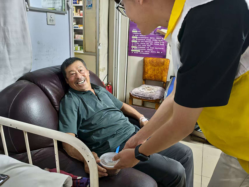 除了贴心的健康服务,活动现场还弥漫着浓浓的粥香,这源于宣慈联秘书长韩智刚的暖心筹备。为了让参与活动的居民,尤其是老年群体能在微凉的雨天喝上一口热粥,韩智刚提前精心准备了八宝粥食材,并联系到青青饭店合作熬制。活动当天,青青饭店老板同样冒着大雨,亲自将熬煮得软糯香甜的八宝粥送到活动现场。一碗碗热气腾腾的八宝粥,不仅驱散了雨天的寒意,更温暖了居民的心田。志愿者们端着粥碗,逐一递到居民手中,居民们接过热粥,脸上洋溢着幸福的笑容,连连向志愿者和爱心商家表示感谢。