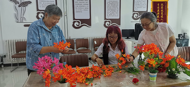 9月8日春风助残义工队队长刘俊琴在东宁街社区日间照料服务站开展手工公益插花制作。