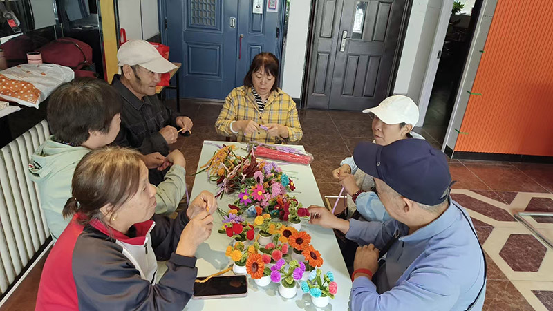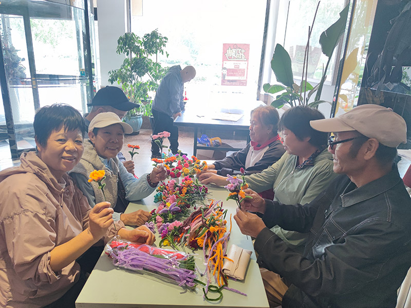随后,活动进入了手工制作环节。霍队长作为手工指导者,带领大家开启了一场创意手工之旅。她向大家展示了如何用扭扭棒编制手工花,一根根普通的扭扭棒,在霍队长的手中仿佛有了生命,左扭右扭间,一朵朵栩栩如生的向日葵和柿子逐渐成形。在霍队长的耐心指导下,大家也纷纷动手尝试,互相交流着制作技巧,活动现场充满了欢声笑语。不一会儿,一朵朵色彩鲜艳、形态各异的手工花就呈现在大家眼前,这些作品不仅展现了大家的创意和巧思,更凝聚了大家的快乐与热情。