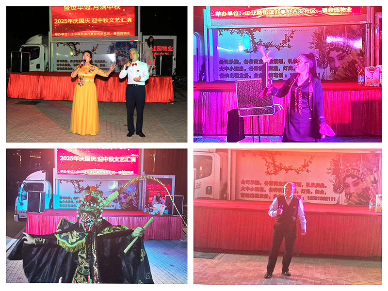 2025年9月28日下午6点,在“国庆”与“中秋”双节来临之际,在桥东区吉安社区广场,吉安社区、碧桂园小区物业公司、众康生义工志愿服务队、京剧社、吉安社区舞蹈队共同举办了一场主题为“盛世华诞,月满中秋”的文艺汇演,为居民们送上了一场精彩的文化盛宴,营造了欢乐祥和的节日氛围。