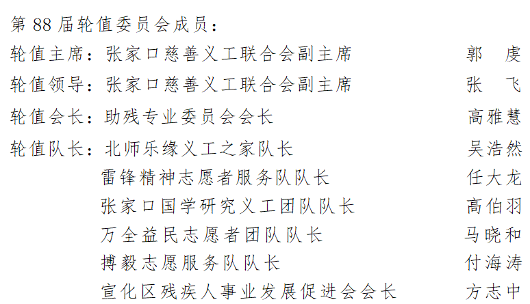 事迹:北师乐缘义工之家队长吴浩然在第88届轮值中表现积极,对待轮值工作认真,严谨细致,准备充足,多次为张家口慈善义工联合会大平台的建设谏言献策,做出贡献。