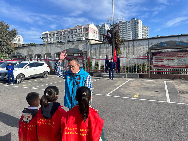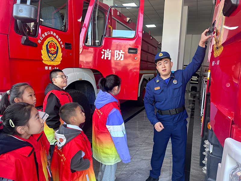 升旗仪式结束后,七位小志愿者排成一排,郑重的向消防救援大队的叔叔们敬少先队礼,齐声说:“消防员叔叔,你们辛苦了!”并从口袋里拿出为消防队叔叔们准备的糖果,送到消防队员的手中。随后,雷锋队的队员参观了桥西应急消队救援队的装备场,装备场库内停放着整齐的消防车,讲解的消防员耐心细致的为在场的志愿者们讲解了消防装备的基本情况,让大家很直观的了解到消防装备的各种功能,也让我们感受到祖国的发展越来越好。活动最后,在党支部书记樊志勇的指挥下齐唱《歌唱祖国》,“祝愿祖国繁荣昌盛,人们幸福安康!”我将怀揣那份执着和热爱,书写对党和人民的无限忠诚”“我爱你,中国!”,国旗之下,大家将自己对祖国的爱大声地说出来,诉说着所有人满腔的爱国情怀。