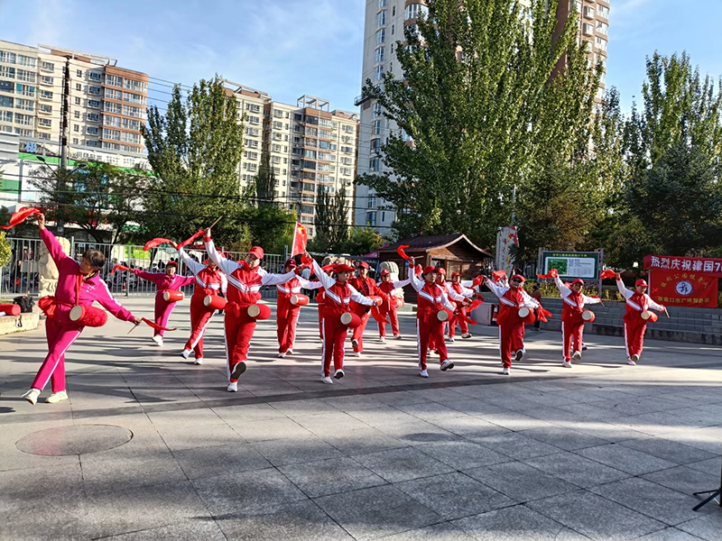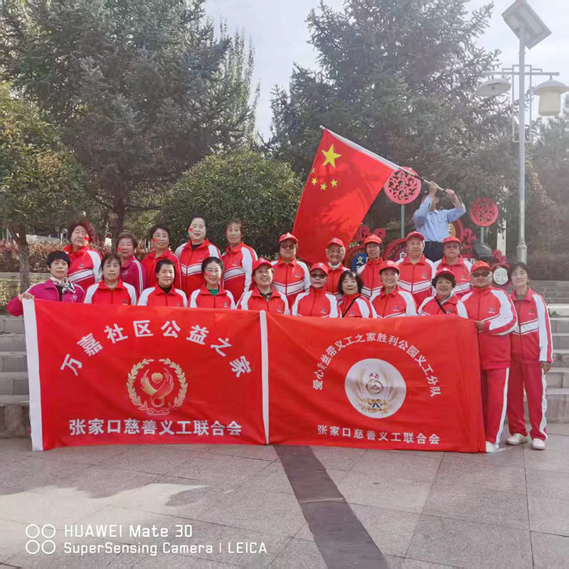 当金秋的微风拂过胜利公园的树梢,将桂花的甜香揉进飘扬的国旗里,10月1日上午在胜利公园由义工队队长杨金梅,万嘉社区公益之家队长冀生梅,新增团队随风漫舞公益队队长周凤琴三人精心策划组织了三个团队的人员,有100余人齐聚在公园的操场上,穿着整齐的节日盛装,兴高采烈的用自己的方式组织了一场别开生面喜迎双节庆典,我们用喜庆的腰鼓开场,公园的游客很多,南来北往,众人的眼神里满是对这场精彩纷呈盛宴的期待。