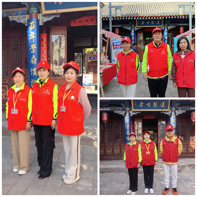 节日期间他们放弃休闲娱乐休息,穿梭在抡才书院、口皮博物馆、金融博物馆之前,黄丝带公益讲解员郭卫兵、宋志华、耿花、季建中、张爱兰、姚文荣、邢利英,特别是苑晓凤同志,由于金融博物馆讲解员家中有事不能参加讲解,苑晓凤便连续参加讲解!他们用热情和真诚为游客们讲述着张家口堡的人文历史,让这个假期增添了更多的文化底蕴和温暖,他们头戴小红帽,身着红马甲,衣着整齐,在堡子里景区的一座座古建筑间。