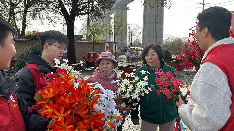 11月8日清晨,张家口经开区马路东市集刚热闹起来,一抹红色便穿梭在人流中——张家口春风助残义工队的大学生志愿者们,在队长刘俊琴的带领下,抱着满箱缤纷仿真花,开启了一场以“助残”为初心的义卖活动。作为一周一次的赶大集日,市集里摩肩接踵,叫卖声与笑声交织,也为这场公益活动攒足了温暖的底色。