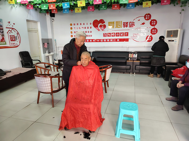 理发过程中,驿站里满是温馨的烟火气。有人夸赞吴桂荣的手艺 “比理发店还细致”,有人和张桂先唠着家常,分享生活里的小事,志愿者们一边聊着天但是手上的活却丝毫不停,汗水悄悄浸湿了额角,他们也只是随手擦一擦,始终保持着专注的模样。从下午两点到夕阳西下,他们没有停歇片刻,送走了一位又一位满意离去的群众,原本空旷的驿站地上,渐渐堆起了薄薄一层碎发,却也装满了群众的感激与认可。