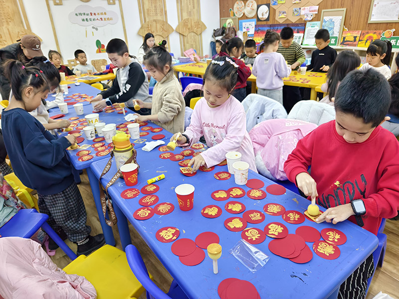 孩子们在志愿者的耐心指导下,认真构思、仔细比划。一双双小手紧握金福字,在红色的卡纸上小心翼翼地粘贴,有的圆润饱满,有的稚趣横生。粘贴完成后,孩子们精心搭配彩珠、铃铛和小巧的中国结,将承载着祝福的“福”字卡片串连成串。时不时,风铃发出清脆声响,“福”字轻轻旋转,仿佛将美好的祈愿播撒开来。