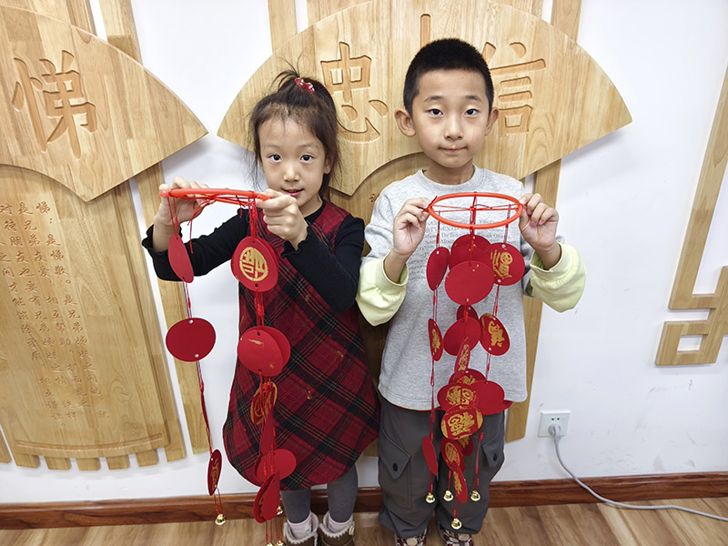 活动最后,孩子们自豪地举起自己亲手制作的风铃合影留念。这些摇曳的福字风铃,不仅锻炼了孩子们的动手能力,更在他们心中种下了传统文化的种子,让新春的祝福在指尖流转,在风中传响。
