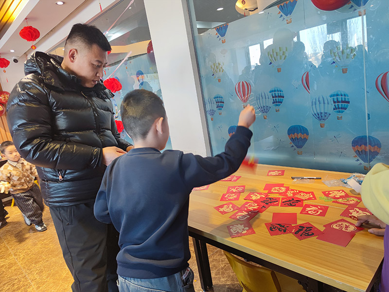 孩子们在家长的陪同下做了很多活动,在做粘福字活动时,孩子们把粘力棒用力的甩出,都想粘到更多的福字,领到更多的奖品;捏饺子活动中,小手捏出形态各异的“元宝”和“花朵”,创意十足;猜灯谜环节笑声不断,每有孩子和家长灵光一闪猜中谜底时,周围便响起阵阵欢呼;剪福字的桌前最是安静,家长和孩子们非常仔细,活动室里只闻纸声沙沙,当一幅幅火红的“福”字展开时,每个人的脸上都洋溢着成就感与喜悦。活动现场暖意流动,欢声笑语交织成最动听的新年序曲。可见,这些特殊的孩子们平日里在老师的陪伴和教导下成长了很多,也收获了很多的欢乐与技巧。