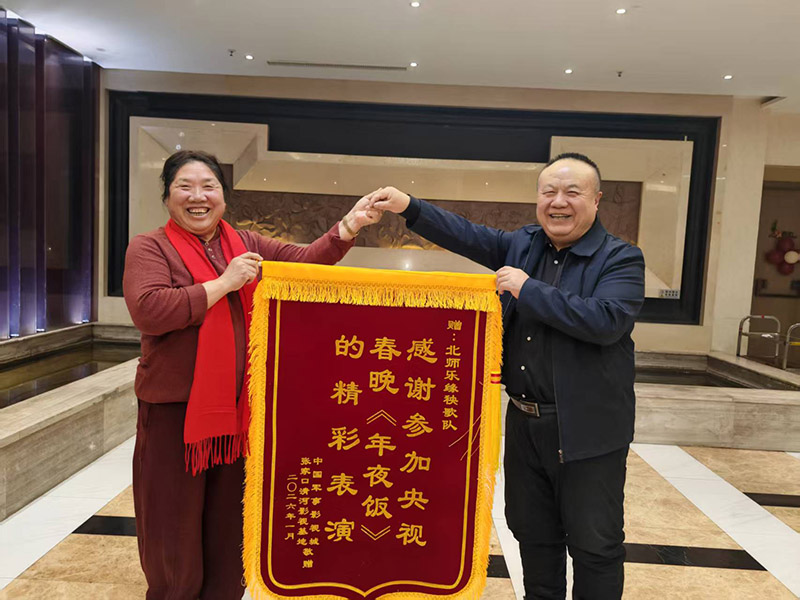 1月23日的张家口清河军事影视基地,寒风裹挟着新春的暖意,一场庄重的锦旗颁授仪式正在这里举行。红色锦旗上“感谢参加央视春晚《年夜饭》的精彩表演”十六个鎏金大字熠熠生辉,清河军事影视基地董事长陈茂岳亲手将这份荣誉递到北师乐缘秧歌队队长李俊连手中,以此表彰这支本土艺术团体在央视春晚《年夜饭》特别节目中作出的突出贡献。掌声中,李俊连紧握锦旗,眼中闪烁着泪光与荣光——这面锦旗,不仅是对一场演出的肯定,更是对非遗传承者坚守与付出的最高礼赞。