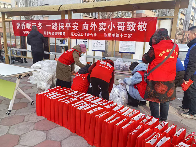 2026年1月26日是中国传统节日“腊八节”。由文明家风志愿队与张家口市桥东区委社会工作部、市场监督管理局、桥东区社会工作联合会、联合举办的以“粥香暖三冬,一路保平安,向外卖小哥致敬”公益活动,在天阳花园小区南1区小广场举行。