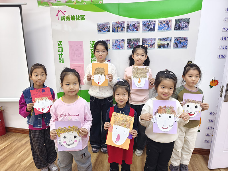 不一会儿,一个个带着“新发型”的可爱小人就诞生了。孩子们举着自己的作品,挤在活动室的展示墙前合影。每一张小脸上都带着得意的笑容,有的作品上的小人吐着舌头做鬼脸,有的眯着眼睛笑出了酒窝。这些歪歪扭扭却充满童趣的作品,成了社区里最温暖的风景线。