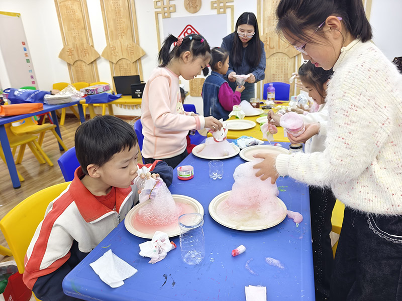 今天下午,岭秀城社区活动室里格外热闹,一场妙趣横生的“彩色泡泡龙”科学实验课正在欢乐上演。 活动室里,几张蓝黄相间的桌子拼在一起,老师站在中间,手里举着实验材料,笑着给我们讲解:“今天我们要做的泡泡龙,可不是玩具哦,它藏着关于表面张力的小秘密!”我们围坐成一圈,眼睛瞪得圆圆的,桌上摆着提前准备好的矿泉水瓶、纱布、皮筋和各色颜料水,每一样都透着新奇。