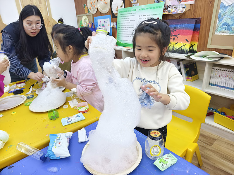 老师笑着说:“泡泡龙能变长,是因为纱布的小孔让水分形成了一层薄膜,我们吹的气把这层薄膜撑得越来越大,就变成了长长的‘龙’啦!”原来这小小的泡泡里,还藏着这么有趣的科学道理。