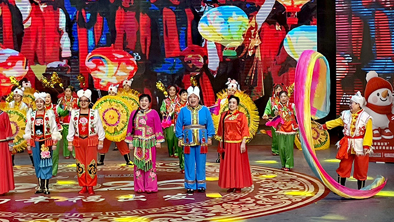 紧随田立东老师的精彩开场,在第三至第五顺位的演出中,李俊莲等演员带来的二人台节目接续点燃现场热度。节目以连唱形式精彩呈现,演员们的唱腔地道醇厚、韵味绵长,字正腔圆的演唱中满含浓郁的塞北地方风情,一开口便将观众带入了辽阔的塞北田间地头,感受着最质朴纯粹的民俗韵味。与此同时,伴舞的队员们身姿舒展、步伐灵动,鲜艳的红绸在舞台上飞舞流转,将秧歌的喜庆热烈与二人台的鲜活灵动完美融合。台上的演员们个个精神饱满、笑容灿烂,每一个动作都充满力量,每一个眼神都传递着发自内心的喜悦,鲜活热闹的画面不仅展现了二人台艺术独有的民俗魅力,更生动诠释了中老年群体不减当年的饱满活力与独特风采,让现场与直播间的观众深深沉浸在这份纯粹的欢乐与热情之中,仿佛也置身于热闹的民俗庆典现场。