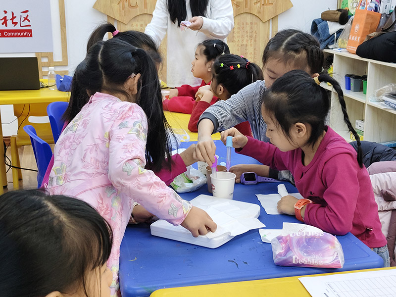 孩子们围坐在色彩鲜艳的桌前,在志愿者老师的陪伴下,从一场小小的科学实验开始了这堂活动。他们把吸管探入装着泡泡液的杯子里,看着透明的泡泡在灯光下折射出七彩的光,清脆的笑声在房间里漾开。