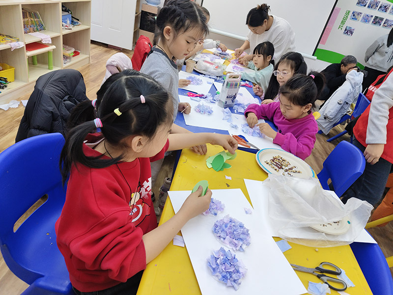 紧接着,大家的注意力转向了更有挑战性的手工创作。他们用剪刀把彩纸剪成细碎的纸片,再将这些紫色、蓝色的小纸片一层层粘贴在卡纸上,组合成饱满的绣球花。指尖翻飞间,原本平整的白纸渐渐绽放出立体的花朵,再添上几片绿色的卡纸叶片,一幅幅生动的手工作品就完成了。