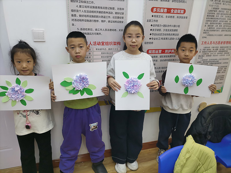 活动的最后,孩子们骄傲地举起自己的作品合影留念。每张稚嫩的脸上都带着满足的笑容,这些亲手制作的绣球花,不仅是他们创造力的展现,更是社区温暖陪伴的见证。