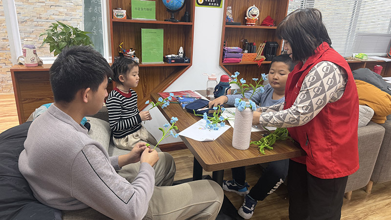 屋外凉风轻扬,社区里的孩子们却兴致盎然、笑意满盈。大家手持扭扭棒,小手一遍遍翻转、一次次弯折,在指尖的灵动操作中勾勒花影。大朋友耐心教着小朋友,会编的小伙伴热心帮扶初学的同伴,在反复尝试与用心打磨里,一朵朵柿柿红、蔷薇花渐渐成型,娇艳的花影映着孩子们的笑脸,可爱得动人心弦。