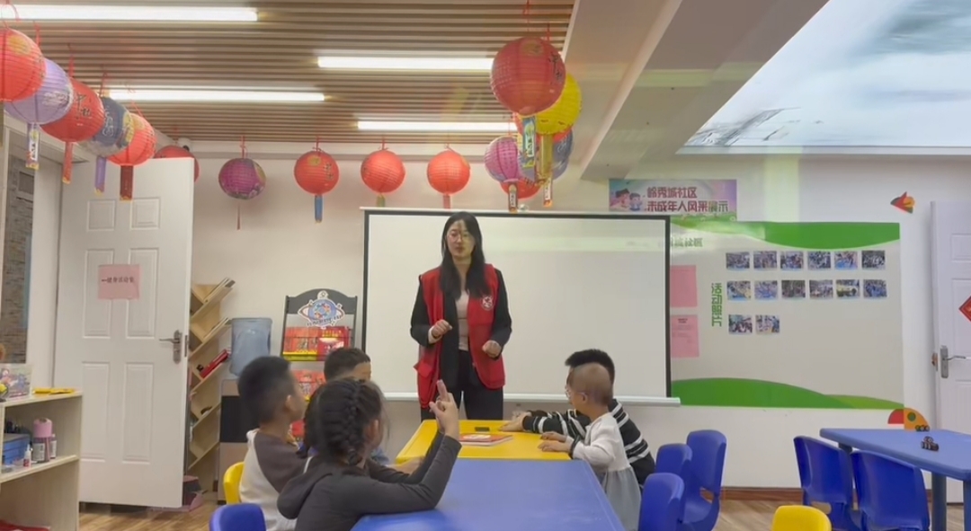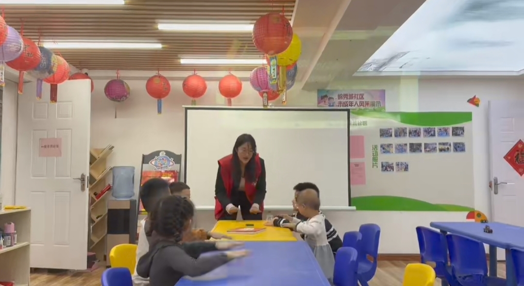 天花板下,红彤彤的纸灯笼串成串,圆滚滚的彩球挤在一起,墙角的福字红得耀眼,年的气息正浓。 活动室里,蓝色的桌椅整齐摆放,孩子们围坐成一圈,小脸上满是期待。穿红马甲的志愿者李老师站在白板前,手里拿着彩纸,声音温柔却有力量。“谁知道春节挂灯笼的寓意呀?”她话音刚落,一个扎着小辫子的女孩立刻高高举起手,眼睛亮晶晶的:“我知道!是吉祥如意,还有照亮回家的路!”