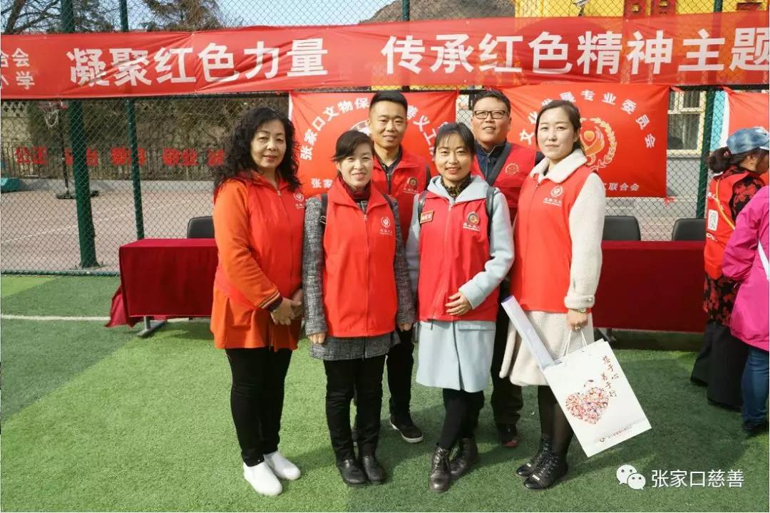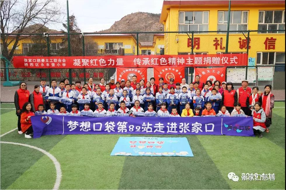 2019年4月11日,张家口慈善义工联合会与桥西区永丰堡小学隆重举行了“凝聚红色力量 传承红色精神主题捐赠仪式”。活动中向桥西区永丰堡小学、桥西区东窑子小学、桥西区南天门小学、桥西区苏家桥小学共计100名学生捐赠了由河北慈善联合基金会提供的“梦想口袋”,折合人民币28000元。桥西区教育体育和科学技术局机关党委副书记、副局长温冠忠,全国团代表、张家口青联委员、张家口慈善义工联合会副秘书长臧沙沙,桥西区教育体育和科学技术局机关党委办主任何海洋,捐赠助学科张利鹏,志愿者代表,张家口慈善义工联合会文化发展专委会会长苏景,及利他义工之家、光之爱、文物保护义工队的义工们参加了活动。同时张家口广播电视台"第一民生630"栏目组的记者现场进行采访录制,网易张家口站及我市多家媒体对本次活动进行了全方位详实报道。