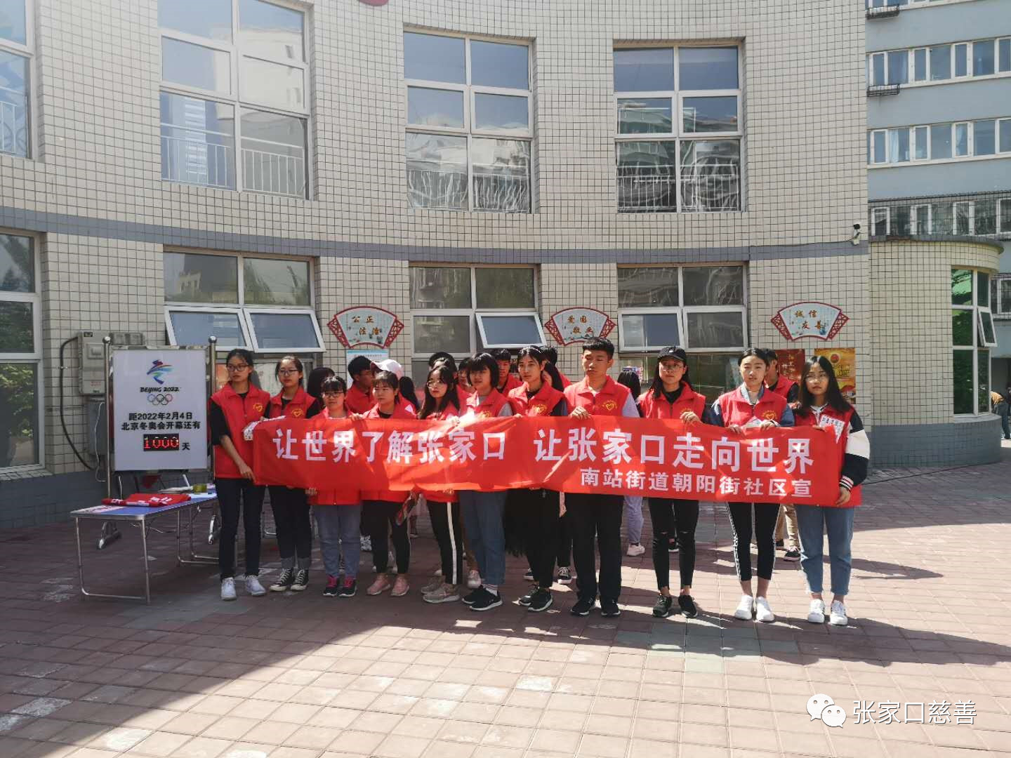 2019年5月11日早,Flying Eagle志愿者团队的十八名志愿者们前往朝阳街社区参与北京2022年冬奥会开幕倒计时活动。今天距北京2022年冬奥会开幕还有1000天,在这值得纪念的一天,我们有幸参与冬奥开幕倒计时活动,志愿者们身穿红色马甲,手举条幅,虽然今天太阳有点大,但是志愿者们依然欢声笑语,这就是志愿精神吧。