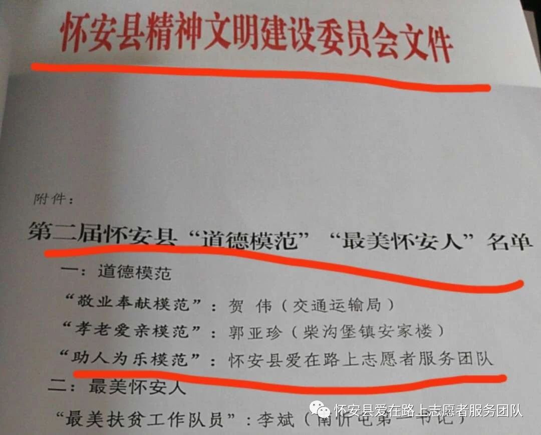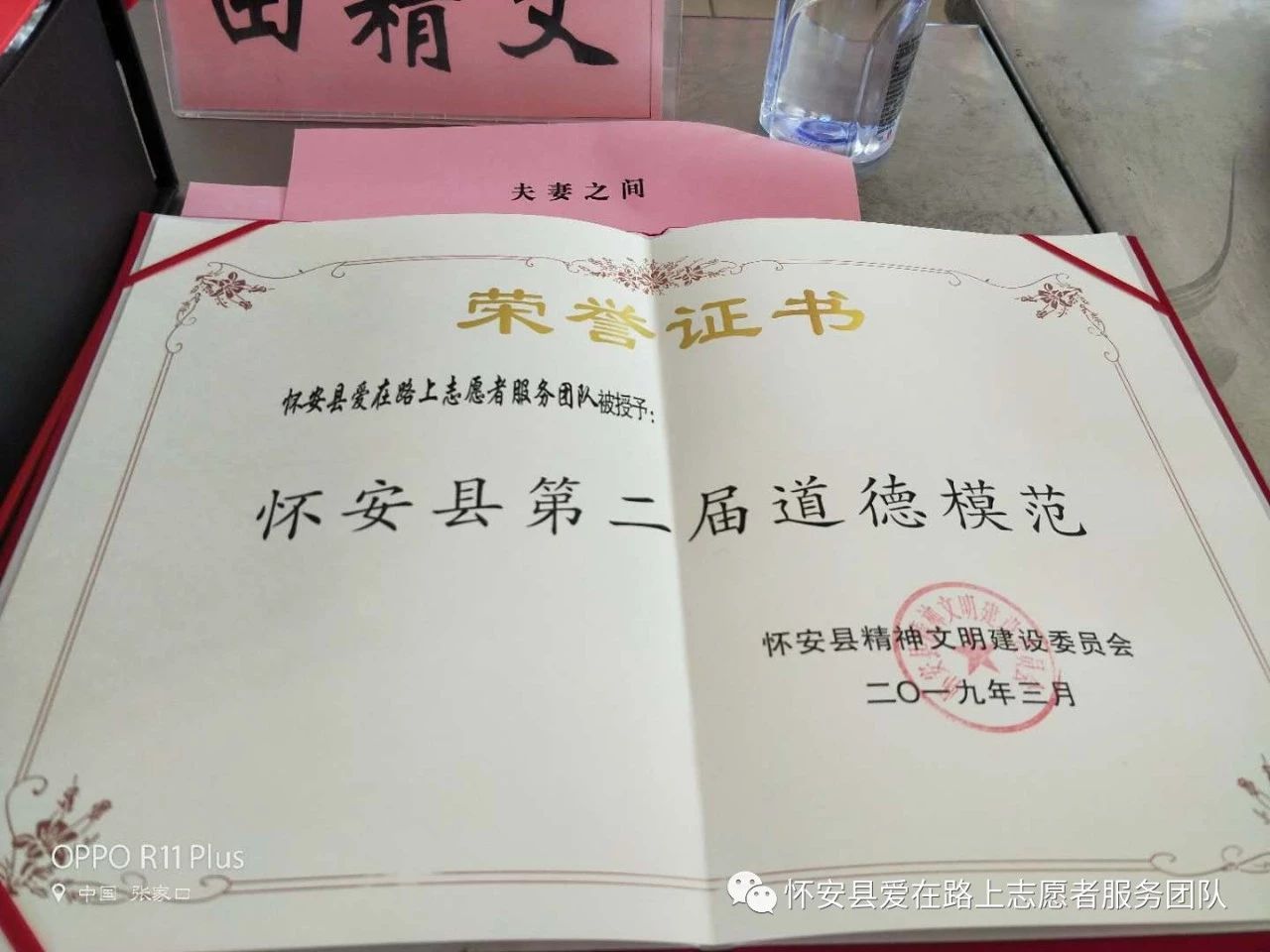 怀安县爱在路上志愿者团队被授予 “怀安县道德模范称号 "