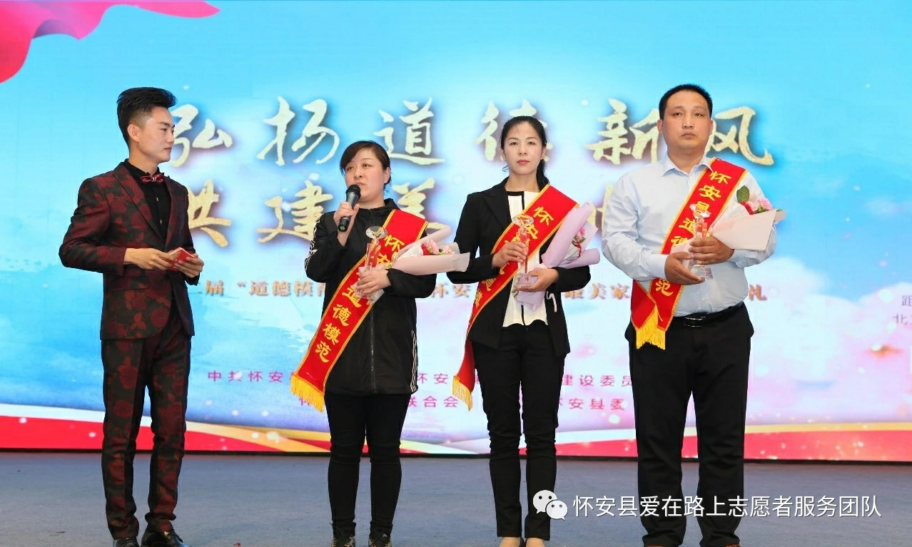 在此次表彰活动中,怀安县爱在路上志愿者团队被评为:怀安县第二届道德模范称呼有热心公益、彰显时代正能量的助人为乐模范团队—怀安县爱在路上志愿者服务团队。