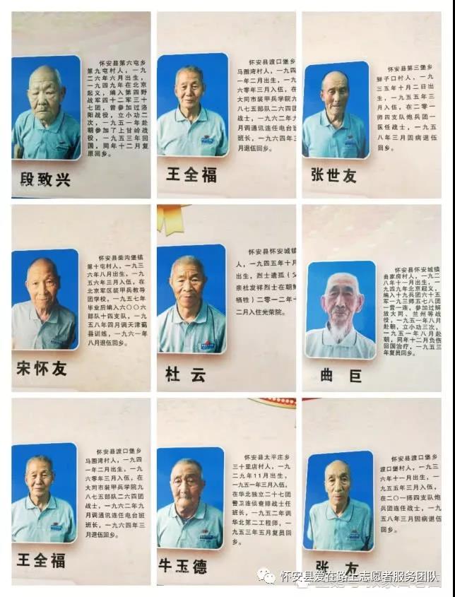 怀安县有这样一群老英雄,在他们年轻之时,在祖国最需要他们的时候,他们辞别双亲,告别妻儿,投身战场,抛头颅洒热血,为祖国的解放和社会的进步做出了重大的贡献。我们不能忘记他们,应该用更多的真诚友善来关爱他们,让他们体会到社会主义大家庭的温暖,安度幸福的晚年!