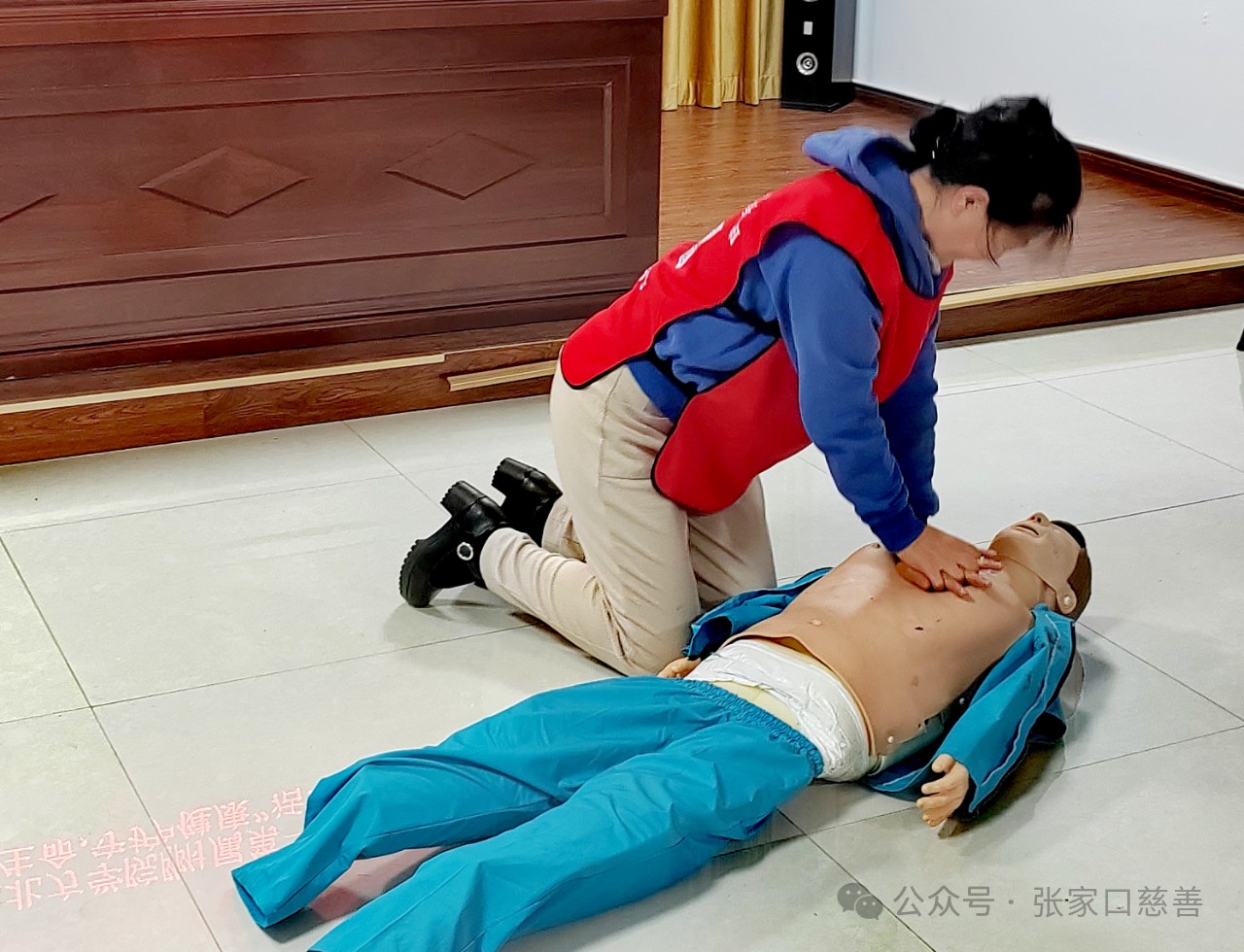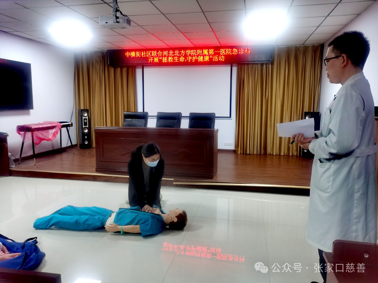 在这个春意盎然的季节里,北师乐缘义工之家队长吴浩然与模特队队长程贵梅带领20余位志愿者在4月8日下午,与社区居民一起共同参加了由中横街社区联合河北北方学院第一附属医院急救诊科举办的以“拯救生命,守护健康”为主题的紧急珍护知识讲座。此次讲座由民盟张家口市委社会服务委员会副主任陈尊生主持,北方学院第一附属医院急珍科医生进行现场演示。