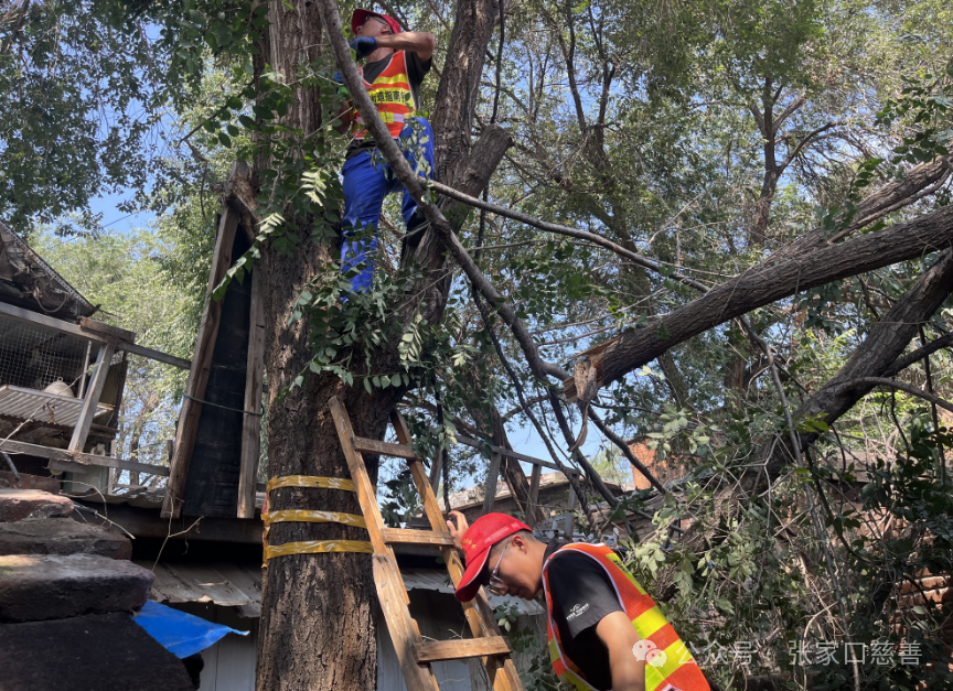 到达现场后,三人首先对两棵大榆树进行了仔细的观察和评估。大树很高,粗壮的枝干纵横交错,掉落的枯枝散落在四周,让人望而生畏。然而,困难并没有让他们退缩,反而更加坚定了他们解决问题的决心。 赵忠队长凭借着丰富的经验,制定了详细的砍树枝方案。他将志愿者们分成了两组,一组负责在树下设置警示标识,提醒过往行人注意安全;另一组则负责准备砍树所需的工具和设备。 一切准备就绪后,张青山副队长身先士卒,爬上了大树。他系好安全带,手持锯子,小心翼翼地开始锯断那些存在安全隐患的枯枝。每一次锯动,都伴随着他的汗水和专注。赵忠队长和张程分队长则在树下密切关注着他的一举一动,不时地提醒他注意安全,同时指挥着周围的工作。 随着时间的推移,一根根枯枝被锯断并安全地运下了树。蒋桂英一家和周围的居民纷纷围了过来,他们的眼神中充满了感激和敬佩。在这个炎热的夏日,志愿者们的汗水湿透了衣衫,但他们的脸上却始终洋溢着满足的笑容。 经过几个小时的艰苦努力,两棵大榆树的安全隐患终于被排除。看着清理干净的院落和不再令人担忧的大树,蒋桂英激动得热泪盈眶。她紧紧握住赵忠队长和张青山副队长的手,声音颤抖地说道:“谢谢你们,谢谢志愿者们!如果没有你们的帮助,我们真不知道该怎么办才好。” 赵忠队长微笑着说:“这是我们应该做的,能为大家解决实际问题,是我们志愿服务队的职责和使命。” 张青山副队长也表示:“只要大家有需要,我们随时都会伸出援手。” 在这个平凡的日子里,阳慈联指南针志愿服务队用他们的行动诠释了“奉献、友爱、互助、进步”的志愿精神。他们用爱心和汗水,为豆腐市街的居民消除了安全隐患,带来了安宁和温暖。他们的善举,不仅赢得了蒋桂英一家的感激,也赢得了整个社区居民的尊重和赞誉。 相信在未来的日子里,阳慈联指南针志愿服务队将继续发扬这种无私奉献的精神,为更多需要帮助的人带去希望和力量,让我们的社会变得更加美好。